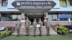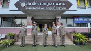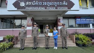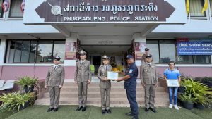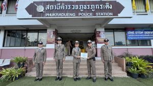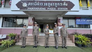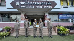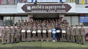 พ.ต.อ.ณัทญา ทองจันทร์ ผกก.สภ.ภูกระดึง นำข้าราชการตำรวจในสังกัด เข้าร่วมกิจกรรมวันตำรวจ รับฟังสารจาก ผบ.ตร. กล่าวคำปฏิญาณและอุดอุดมคติตำรวจ ไหว้สิ่งศักดิ์สิทธิ์ของ สภ.ภูกระดึง พร้อมมอบเกียรติบัตรเชิดชูเกียรติ ให้แก่ข้าราชการตำรวจ และประชาชน ผู้สนับสนุนช่วยเหลือกิจกรรม งานตำรวจของ สภ.ภูกระดึง ณ ร้านหน้าสถานีตำรวจภูธรภูกระดึง