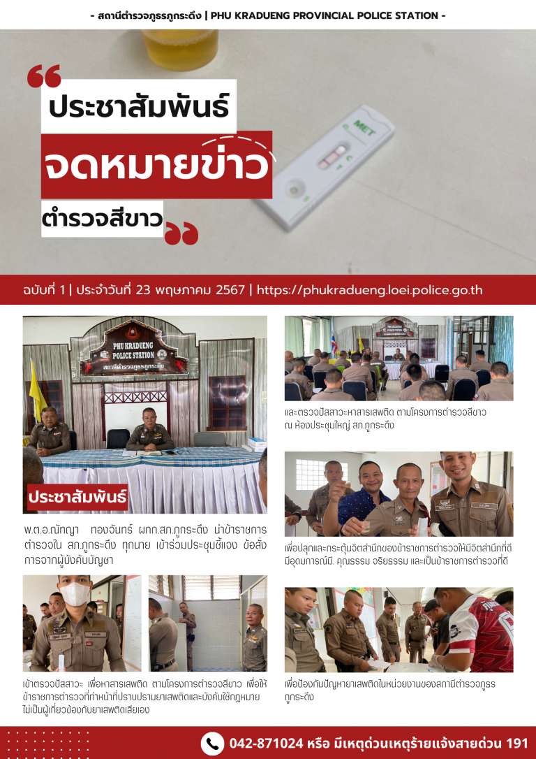 ข่าวประชาสัมพันธ์,ข่าวกิจกรรม,ข่าวภารกิจผู้บังคับบัญชา สภ.ภูกระดึง ตรวจปัสสาวะ ข้าราชการตำรวจใน สภ.ภูกระดึง ทุกนาย หาสารเสพติด ตามโครงการตำรวจสีขาว 23 พ.ค.67 เวลา 10.00 น. พ.ต.อ.ณัทญา ทองจันทร์ ผกก.สภ.ภูกระดึง นำข้าราชการตำรวจใน สภ.ภูกระดึง ทุกนาย